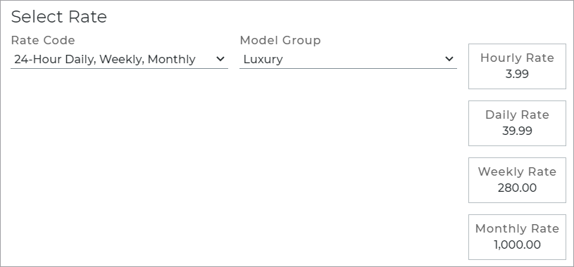 ) the Rate Information section. Otherwise, after a date range is selected on the appointment or agreement, select a Rate Code and Model Group, if necessary, to display the hourly, daily, weekly, and/or monthly rates associated with your selections.