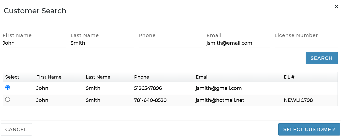 After searching, you can select the customer record you want to use on the agreement. The name, phone, email, driver's license number, state, country, and date of birth will be filled in, as well as the address, automobile and insurance information, if present on the record. (Note that any fields filled in on the agreement prior to searching will be overwritten.)