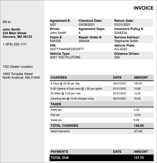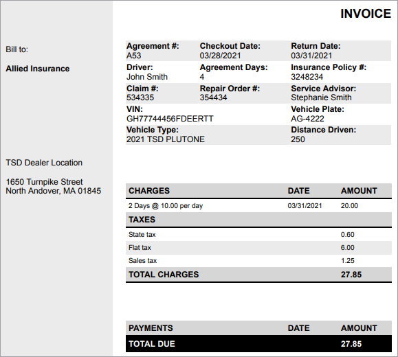 When only a daily rate is applied to agreement charges, an ADD SPLIT INVOICE button is available for cases when a third party company, such as an insurance company, is responsible for some or all of the agreement's daily rate charges, and, if you choose, taxes on its portion of the rate charges. That way, you can generate two invoices: one to send to a billing company, and to provide to the customer (driver). See "Split Invoices with Billing Companies" for more information.