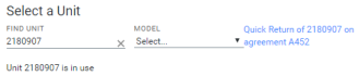 When opening an agreement or performing an exchange, if you need to assign a unit that is In Use on another agreement (excluding Shuttle and Internal Use agreements), you can use the Quick Return option to close or close pend the agreement and assign the unit. The Quick Return option is displayed after typing in the Unit Number. See "Perform a Quick Return" for more information.