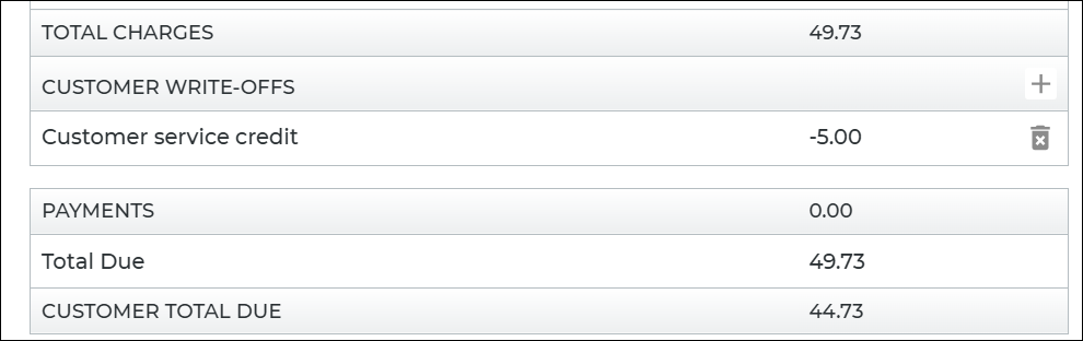 5. The Write Off (as a negative value) is included in the Charges grid. While the Total Charges will still show the total amount in charges on the bill, the Customer Total Due will be adjusted to reflect the subtracted amount on Charges grid and on the invoice.