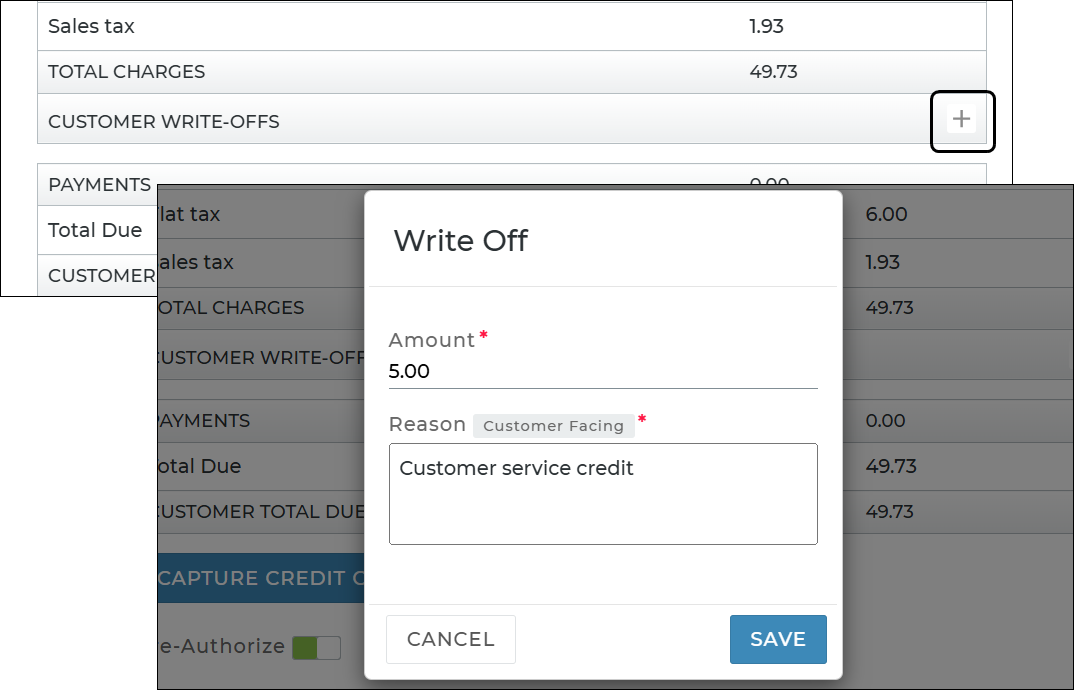 2. Add the amount to write off, up to the customer amount due, and enter a reason for the write off, up to 50 characters.