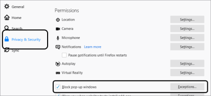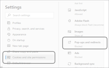 - Select the Cookies and site permissions tab, then select Pop-ups and redirects.