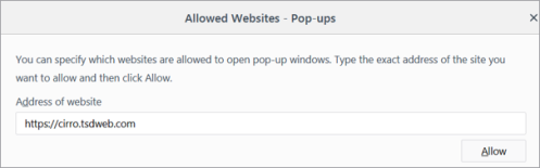 - On the Allowed Sites – Pop-ups dialog, enter the URL https://cirro.tsdweb.com and click Allow, then click Save Changes.
