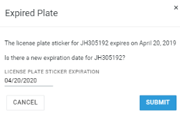 - Plate and sticker expiration checks: ATMS GEN2.0 checks the license plate and inspection sticker expiration dates on returning vehicles. If the date has passed, or if it falls before the agreement's Return Date, a message is displayed, including the number of days remaining, if applicable.