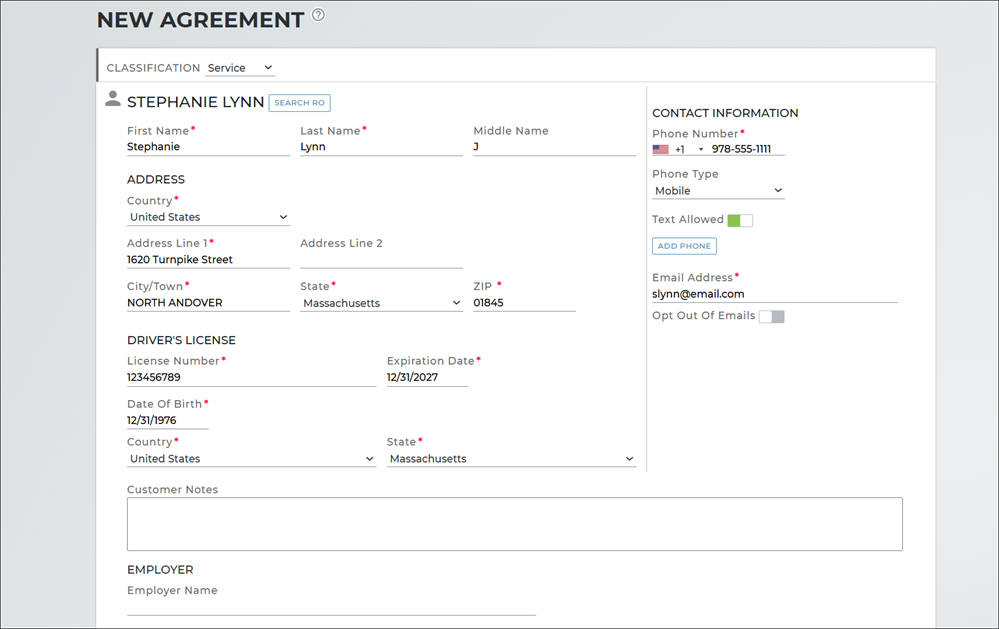 - (Optional.) Search for a customer. Click at the top of the customer section to search by any combination of full First Name, Last Name, Phone, Email, and/or License Number, based on exact field matches. You can then select the customer record you want to use on the agreement. See "Customer Searches" for more information.