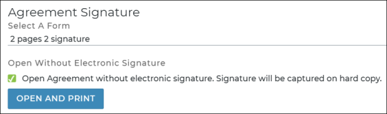 - Print a hard copy and collect a signature. Select the "Open Agreement without electronic signature" check box, then click . Print the agreement form and capture the signature on the hard copy. If your location uses automatic texts or emails, a copy of the unsigned agreement form PDF is texted or emailed to the customer, as long as the customer has opted to receive texts or emails, respectively.
