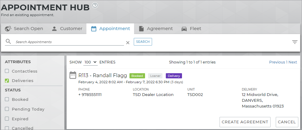 • On the web:  Access the Appointment Operations Dashboard to view a snapshot of appointments due for delivery today (based on Checkout Date) and open agreements due for collection today (based on Collection Date). and the Appointment Hub and Agreements Hub search filters on the Home page.