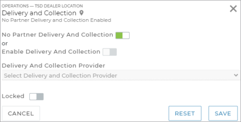 1. Make sure Delivery and Collection is turned on for your location. The Delivery and Collection setting must be enabled on your system, with the No Partner Delivery and Collection toggle selected.