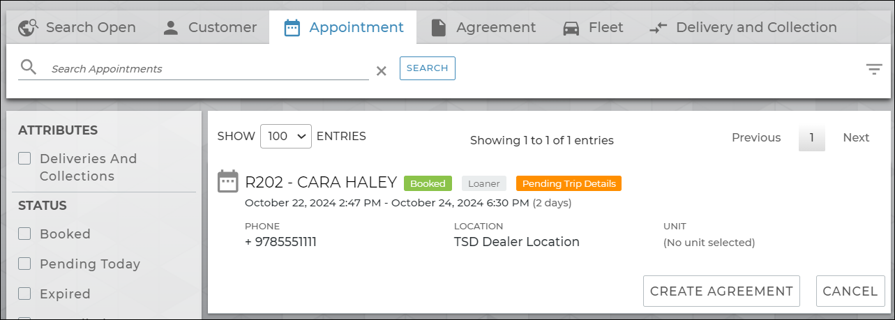 Note: If this is an appointment, the appointment is automatically opened into an Incomplete Pre-Delivery agreement, where you as assigned as the Delivery Driver (even if there was a previous driver assigned).