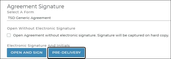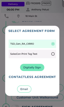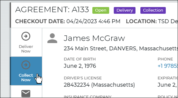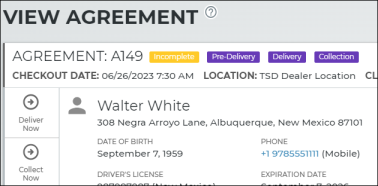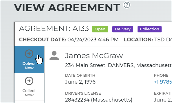 You can either open a Delivery and Collection agreement with a signature and all the latest unit and checkout information, or pre-deliver the agreement to the customer and have the driver obtain a signature and this information, then open it when delivery is complete.