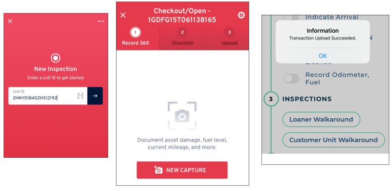 Delivery and Collection unit and customer inspections on the mobile app use Record360 integration, which lets you upload photos, videos, and notes to Record360. See "Record360 Integration" for more information.