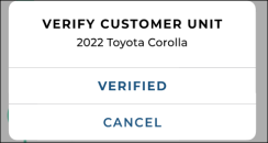 - Verify Customer Unit: Make sure you're returning the correct vehicle for service. Make sure the Year, Make, and Model of the customer automobile associated with the appointment / agreement matches the actual vehicle. Tap Verified if it's the correct vehicle, or Cancel to return to the checklist without verifying the vehicle.