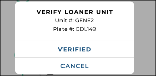 - Verify Loaner Unit: Before you start your trip, make sure you're delivering the correct unit to the customer. Make sure the Unit Number and License Plate Number of the unit associated with the appointment / agreement matches the actual vehicle. Tap Verified if it's the correct unit, or Cancel to return to the checklist without verifying the unit.