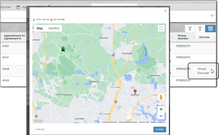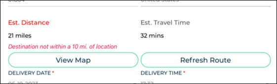 - For your location (on the mobile app): When you view an agreement, a View Map button is available to view the driver's route on a map, and a Refresh Route button is available to refresh the information based on the entered address. This map is available until the driver indicates arrival at the customer's destination.
