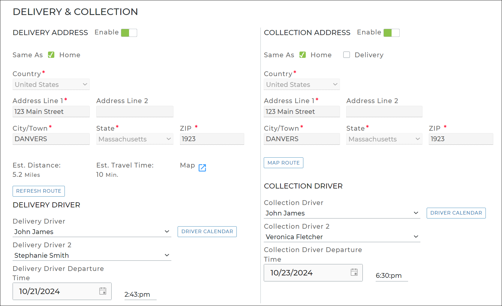 Note: Delivery and collection departure dates / times are set, by default, to the Checkout Date / Time and expected Return Date / Time, respectively. If the route is mapped (manually via or automatically, if applicable), they reflect the Checkout / Return Date/Time subtracted by the estimated travel time.