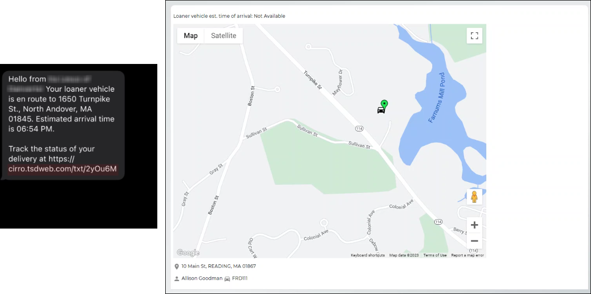 As long as the driver has the mobile app open on his or her device, both you and your customers can track the driver's route on a map for the duration of the trip for complete visibility into driver's location and status. (Once a driver has completed the trip by indicating arrival back at the dealership (via the Arrived at Dealership toggle on the trip checklist), the URL to the map is no longer accessible; accessing it displays the following message: "Your Driver has Arrived.)