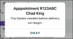 However, if this is an appointment that is still in Pending Trip Details / Pending Details status, which means it still requires additional trip information, the app displays the following message: "Trip Details needed before delivery can begin."