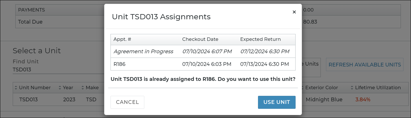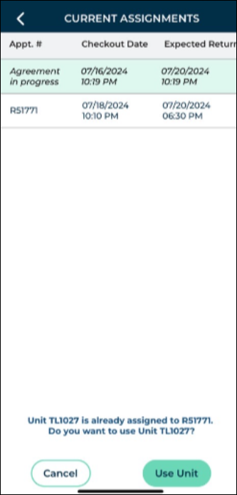 - is not assigned to an appointment or agreement that has an overlapping Checkout Date or Return Date. (If assigned to an appointment, you are given the option to use the unit and remove it from the appointment.)
