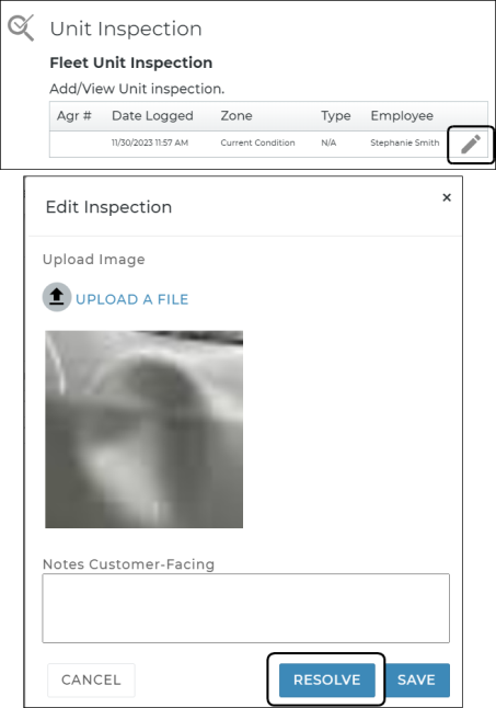 - Current Condition inspections are present in the Fleet Unit Inspection grid. To make edits or resolve the inspection, edit (