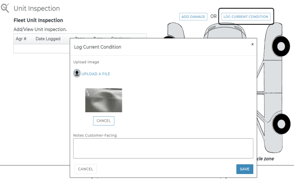You can record results of your walkaround inspections directly to a unit record (if the unit is not In Use) or to an agreement, uploading photos and marking areas of damage on the vehicle or logging its current condition, as needed.