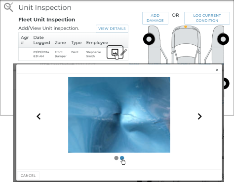 ) in the Fleet Unit Inspection grid to bring up the image slider, where you can click the arrows or the dots on the bottom to rotate through images.