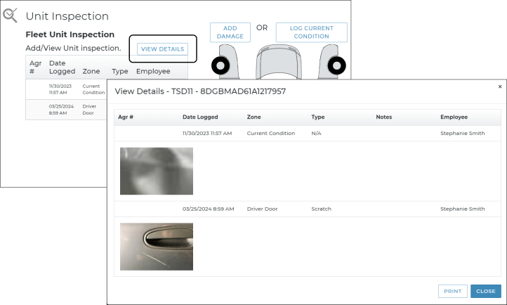 The Fleet Unit Inspection grid contains a comprehensive list of inspections performed on the unit, with a button to view more details, such as photos and notes, and print this information as a PDF.