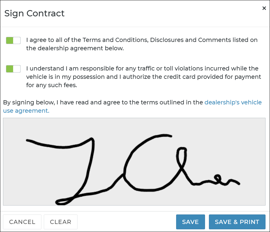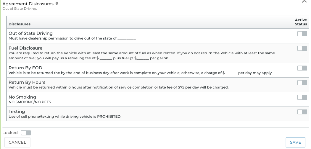 So, for example, if you have a disclosure about mileage fees ("You are expected to pay [Mileage Charge] for driving over 200 miles"), you can toggle on this disclosure to make it active and display on your locations' agreement forms.