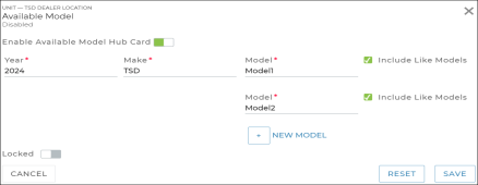 Once you toggle on Enable Available Model Hub Card, enter the Year, Make, and name of the Model. If needed, click to add multiple model names for that model. (The first model listed will determine the actual name of the Dashboard hub card.)