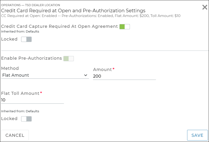 - Credit card information: Credit Card Required at Open and Pre-Authorization Settings