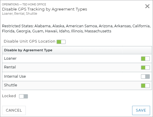 This setting, unavailable for editing, is managed by TSD to set up TSD Telematics, which provides real-time fuel, mileage, and location information to help you assess availability, speed up your agreement process, plan maintenance, and recover fuel charges.