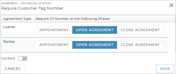 Use this setting to make the Customer Tag Number field required to complete different types of appointments, open agreements (web and mobile), and/or close agreements (web and mobile). You can do this for Loaner and Rental appointments and agreements, depending on the Agreement Types made available for the location.