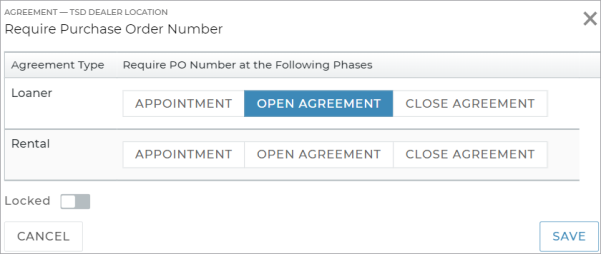 Use this setting to make the Purchase Order Number field required to complete different types of appointments, open agreements (web and mobile), and/or close agreements (web and mobile). You can do this for Loaner and Rental appointments and agreements, depending on the Agreement Types made available for the location.