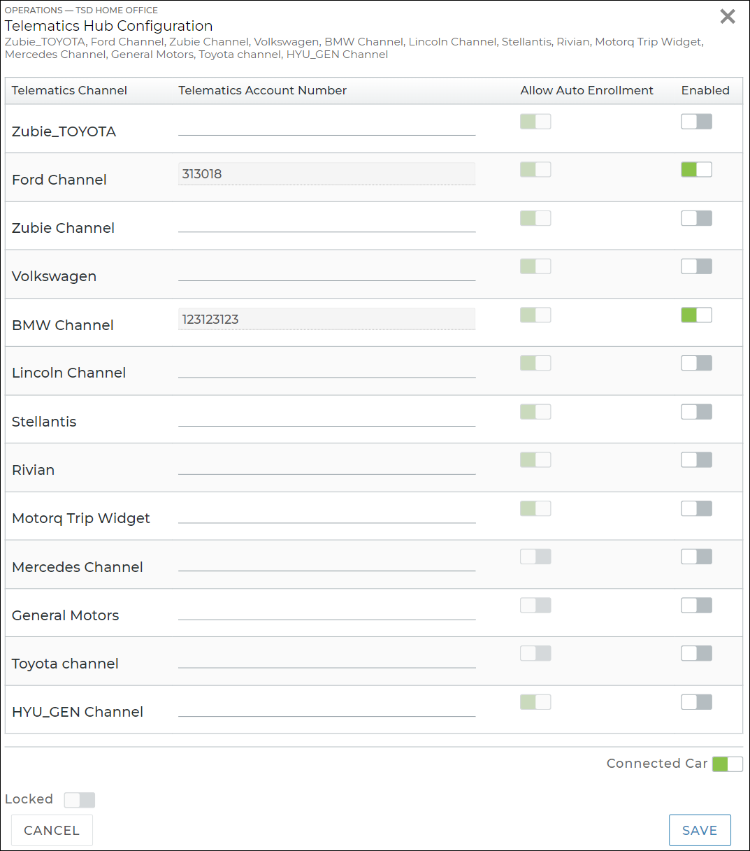 The Telematics Hub Configuration setting is managed by TSD and indicates whether your system is set up to retrieve telematics from one or more of our integrated providers, or "channels".