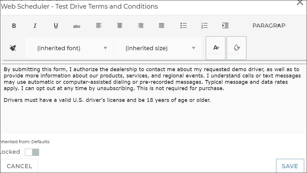 If you use TSD Web Scheduler on a website to optimize test drive bookings, you can make your location's terms and conditions for test drives available to your customers.