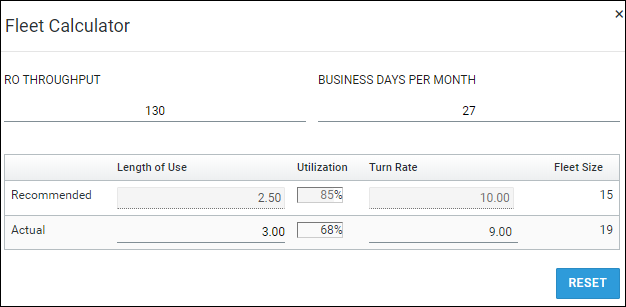 Use the tool on the Fleet Performance dashboard to create different “what-if” scenarios by changing your Length of Use (LOU), Utilization percentage, and Turn Rate values for your monthly RO Throughput (repair orders completed per month).