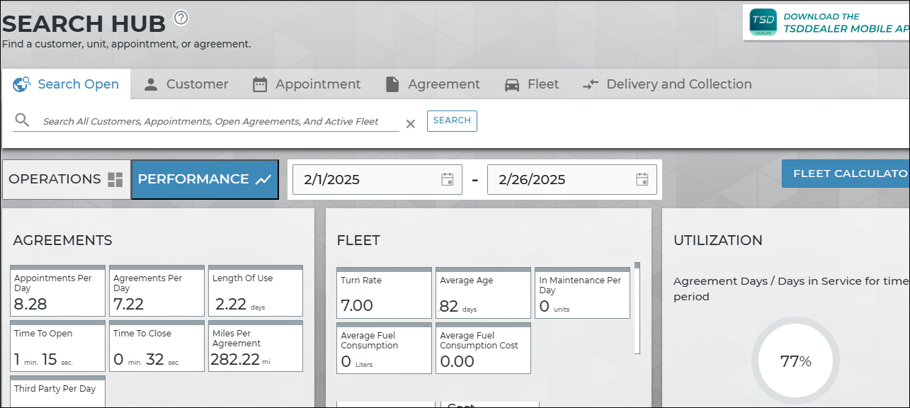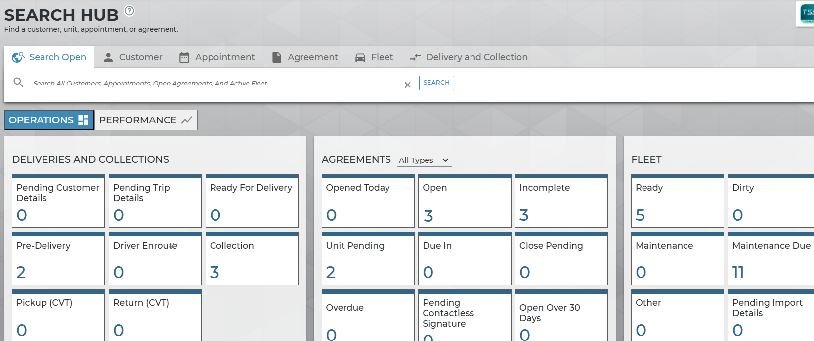 On the Search Open tab on the Home page, access all appointment, agreement, and fleet statistics for your current location (selected at the top of ATMS GEN2.0) in one place, for easy viewing.