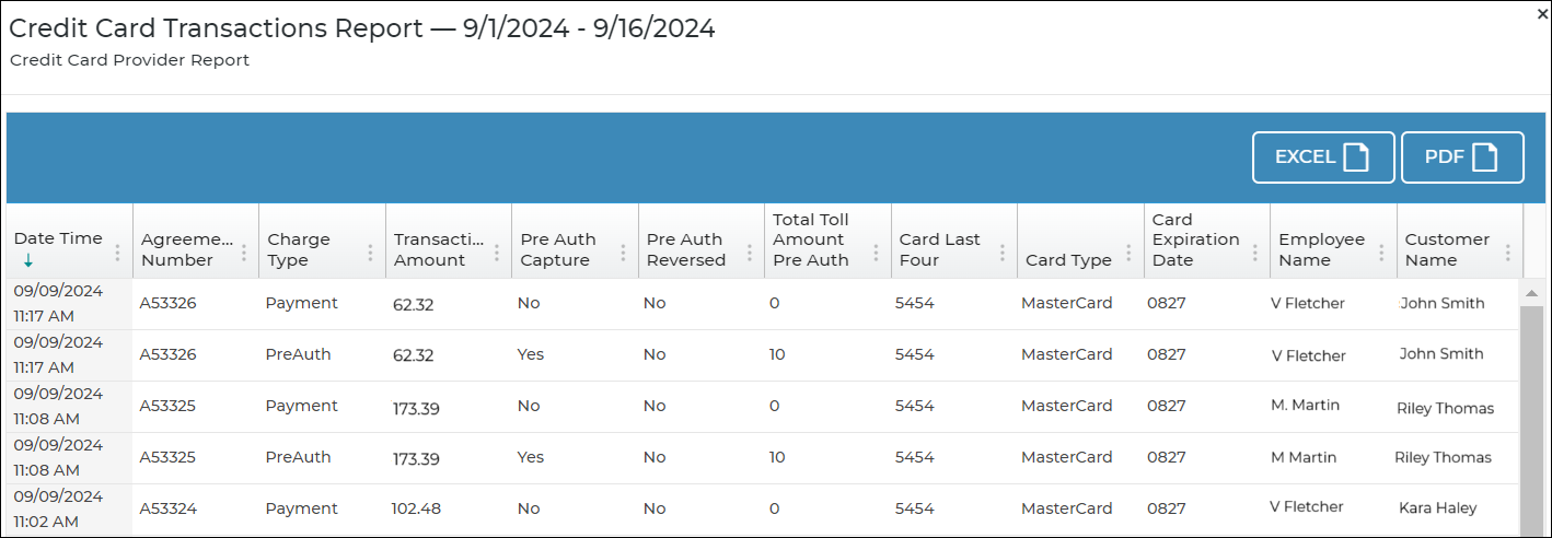 The report includes credit card transactions processed during the reporting period, regardless of the agreement date range.