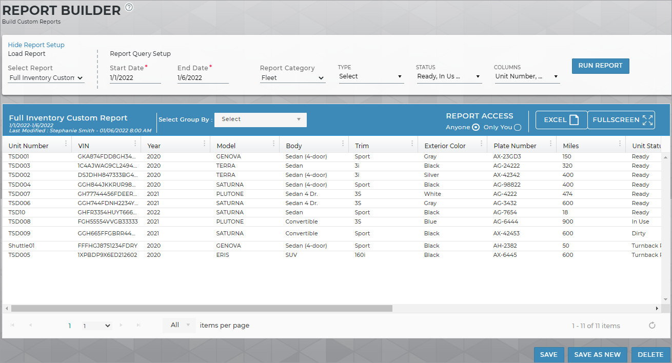 Run the Full Inventory report to view information for all active units currently at your location, including the last date a unit returned from an agreement.