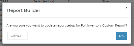 - After you have finished modifying your report in the Report Builder, click . A message is displayed: "Are you sure you want to update report setup for [your Report Name]? Click to continue saving your new custom report.