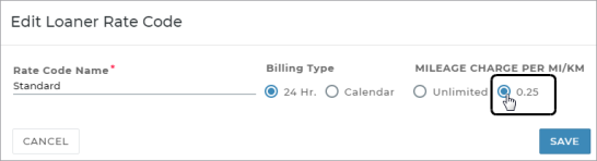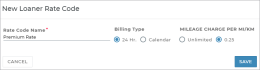 If your location charges for mileage, use the Mileage Charge per MI/KM setting within a Rate Code to indicate whether your location's Mileage Charge applies to the Rate Code, or whether the Rate Code offers Unlimited miles. By default, all Rate Codes offer unlimited miles. See "Set up a Mileage Charge" for more information.
