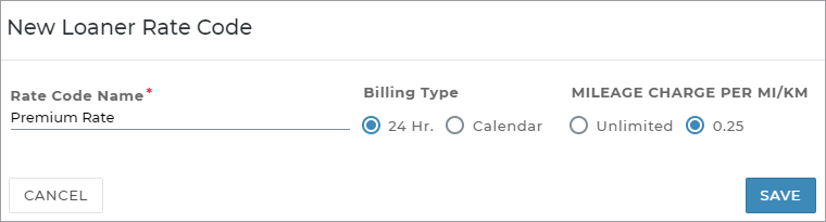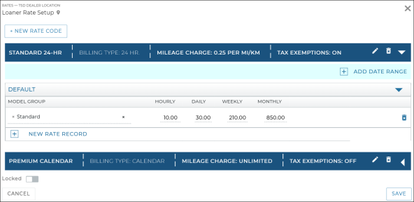 If your location offers rates for loaner agreements, use this setting to create Rate Codes and hourly, daily, weekly, and monthly daily rates to be associated with models and made available on new loaner appointments and loaner agreements. When creating Rate Codes, you can choose whether a Mileage Charge will apply, as well as exempt certain taxes from applying. See "Rates, Charges, Fees & Taxes Setup" for more information.