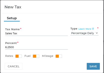 7. Set up taxes using the Taxes Setup setting. Apply taxes to rates, fuel, and mileage, as needed.