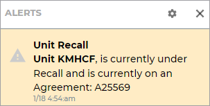 If you've set up Recall Alerts within the Alerts Hub management setting and have them turned on within the Alerts panel, an alert will be generated when a unit is associated with an active recall is In Use on an agreement.