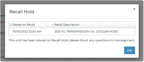 When attempting to assign a unit to an appointment or agreement, if there are one or more active recalls associated with the unit, the application displays a pop-up Recall Hold alert letting you know the unit cannot be used: