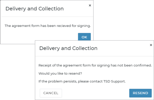 - Messaging when a signature URL is not sent to the Delivery and Collection provider's driver app. When it comes to sending the agreement form to the Delivery and Collection provider's app to obtain a customer signature, after clicking , a message is displayed either confirming that the agreement form URL was successfully sent to the provider, or informing you that there was an issue. If there was an issue, you can click to resend the contactless URL to the partner's app, or to return the user to the View Agreement screen without resending the agreement URL.