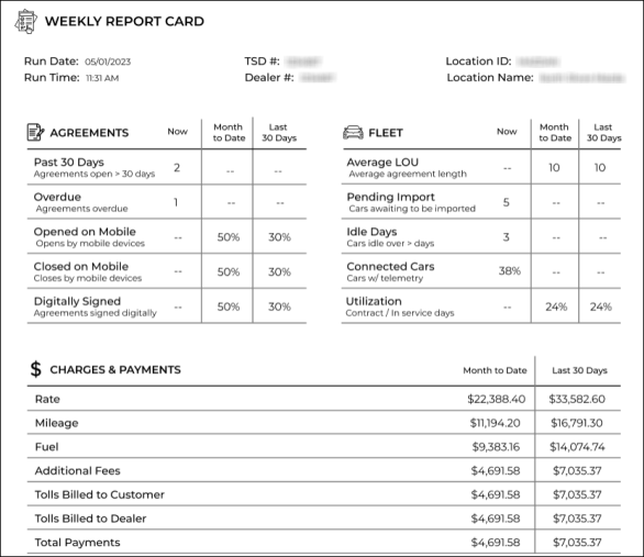Each Report Card is generated and emailed to select employees on a weekly basis  and contains a snapshot of a single location's agreement, fleet, and charges information, as well as metrics over various reporting periods (e.g., Month to Date, Past 30 Days, and Now).