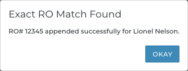 - If only one RO is found, it is automatically added to the record; an "Exact RO Match Found" message is displayed: "RO# [Number] appended successfully for [RO Customer Name]."