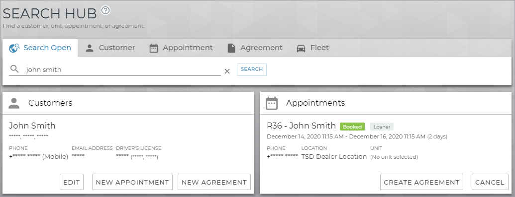 Any search performed on the Search Open tab is carried over to the other tabs. For example, if searching for 'Smith', switch over to the Agreement tab view your results on the Agreement Hub.