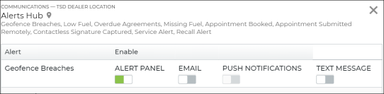 • Turn on Geofence Breach Alerts. The Telematics Hub offers geofencing capabilities to let you set geographic virtual boundaries, or geofences, around an area so you can be alerted when vehicles leave your parking lot or otherwise designated service area. Make sure your Alerts Hub management setting has Geofence Breach alerts turned on, then use the Geofence Breach Alerts management setting to toggle on the types of alerts you want to see.